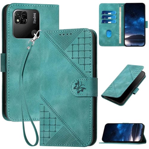Funda de Cuero con Tapa y Cordón para Redmi 10A Yx0080 con Diseño En Relieve de Mariposa y Cuadrícula (Azul Claro)