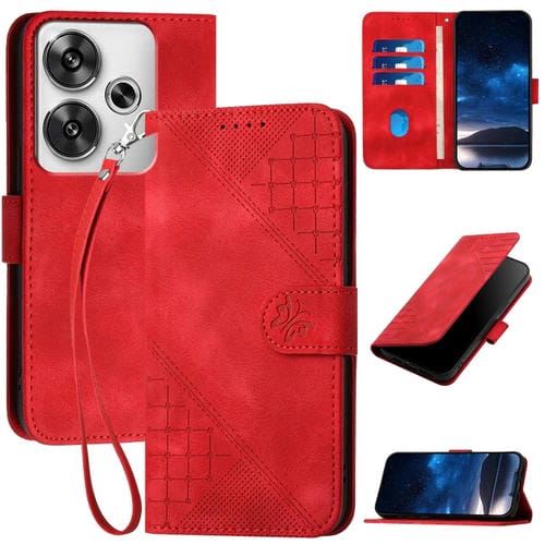 Funda de Cuero con Tapa y Cordón para Redmi Turbo 3 Yx0080 con Diseño En Relieve de Mariposas y Cuadrícula (Rojo)