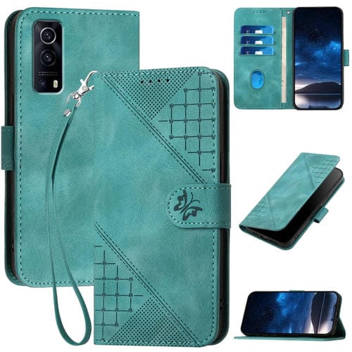 Funda de Cuero con Tapa y Cordón para Vivo Y52 5G Yx0080 con Diseño En Relieve de Mariposa y Cuadrícula (Azul Claro)