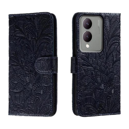Funda de Cuero con Tapa y Diseño de Flores En Relieve para Vivo Y17S (Azul Oscuro)