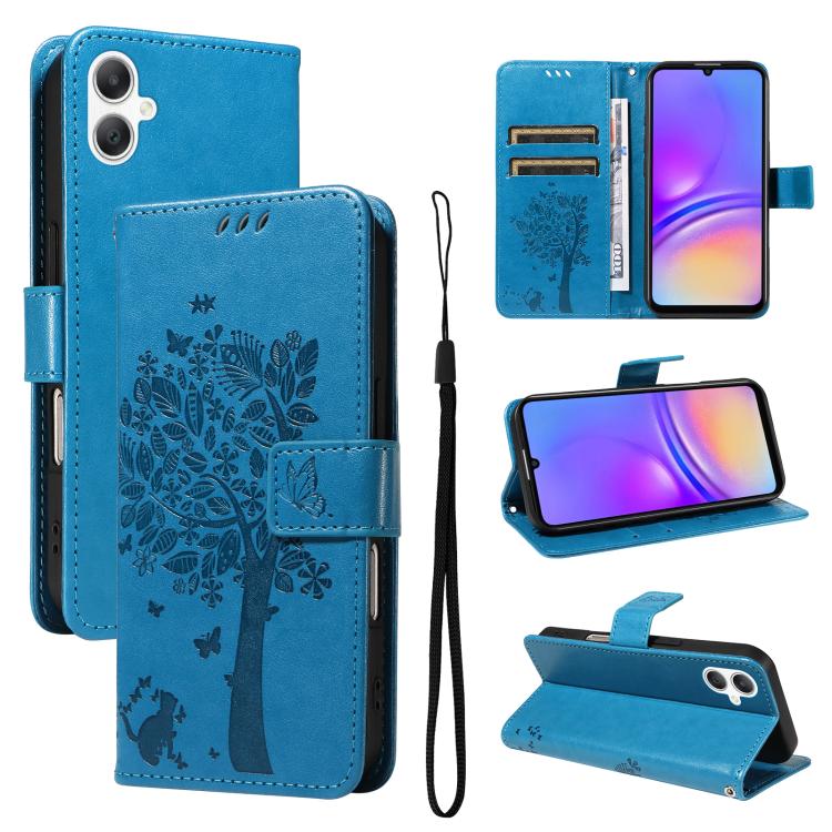 Funda de cuero con tapa y estampado de árbol y gato para Samsung Galaxy A07 5G (azul)