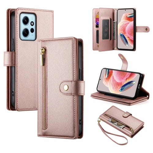Funda de Cuero para Teléfono con Nueve Ranuras para Tarjetas y Cremallera para Redmi Note 12 4G/Note 12R Pro (Rosa)