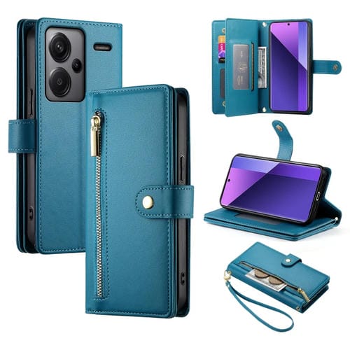 Funda de Cuero para Teléfono con Nueve Ranuras para Tarjetas y Cremallera para Redmi Note 13 Pro+ (Azul)