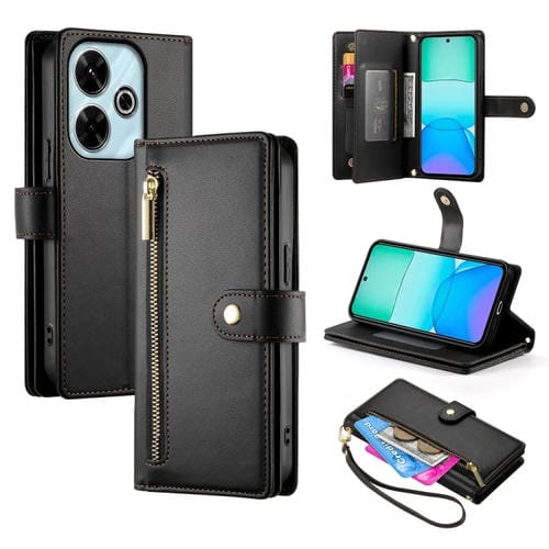 Funda de Cuero para Teléfono Redmi 13 con Nueve Ranuras para Tarjetas y Cremallera (Negra)