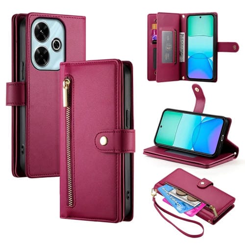 Funda de Cuero para Teléfono Redmi 13 con Nueve Ranuras para Tarjetas y Cremallera (Rojo)