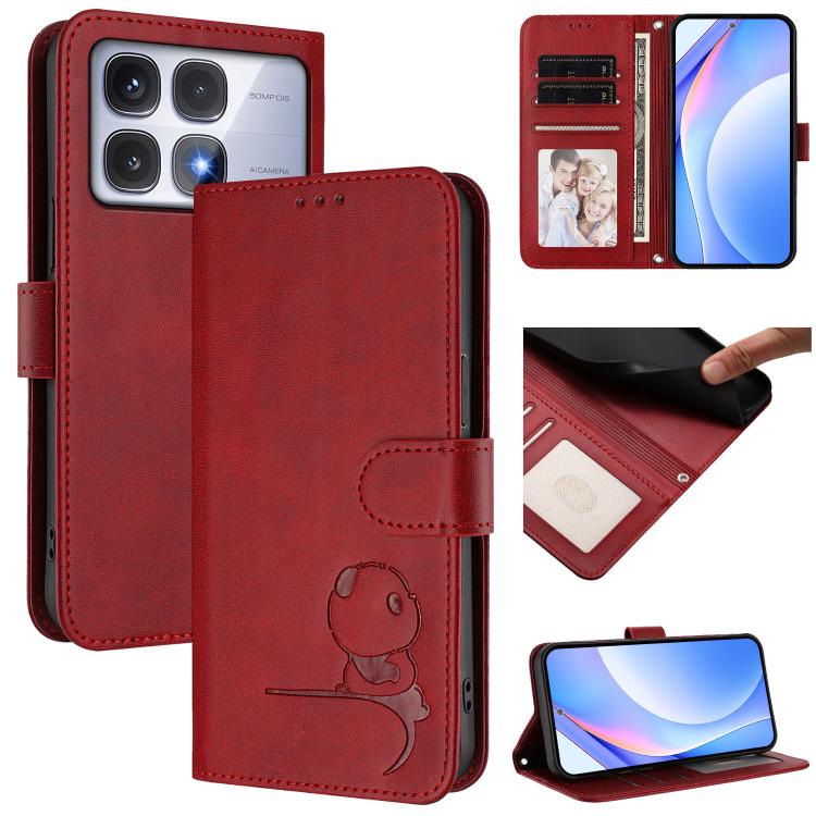Funda de cuero RFID con estampado de panda y cordón para Redmi K70 Ultra (rojo vino)