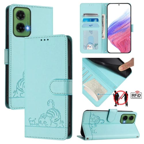 Funda de Cuero Rfid para Motorola Moto G35 con Estampado de Rata y Gato en Relieve y Cordón (Verde Menta)
