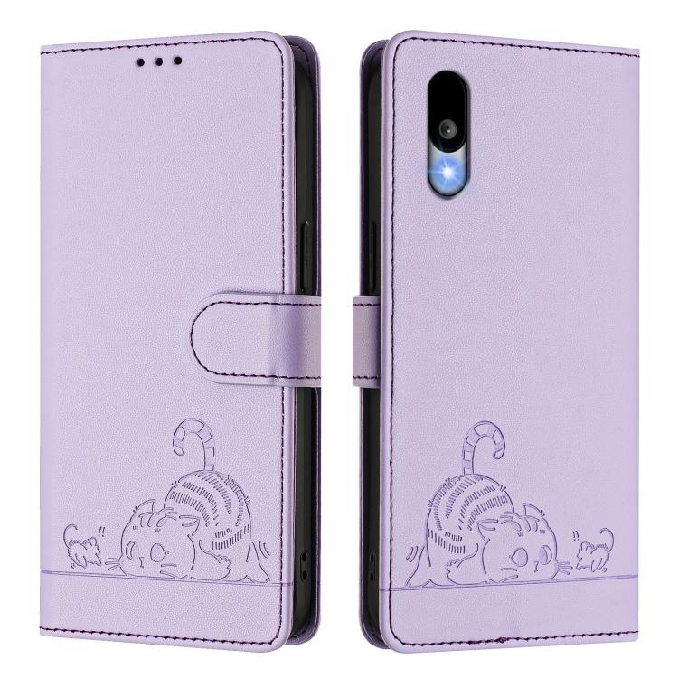 Funda de Cuero Rfid para Sharp Basio Active 3 con Patrón Gato y Rata y Cordón (Morado)