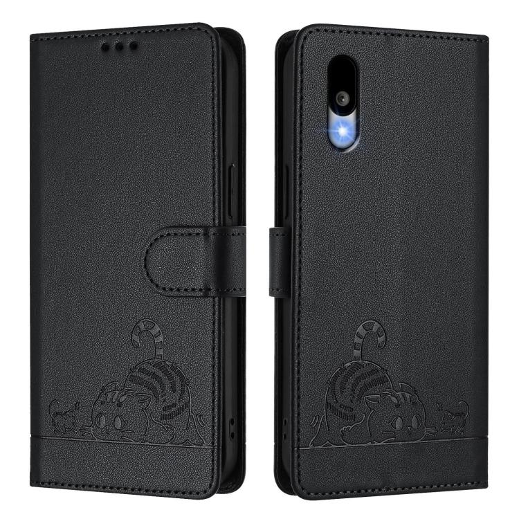 Funda de Cuero Rfid para Sharp Basio Active 3 con Patrón En Relieve de Gato y Rata y Cordón (Negro)