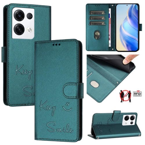 Funda de Cuero Rfid con Relieve de Sonrisa Global para Oppo Reno8 Pro 5G (Verde Pavo Real)