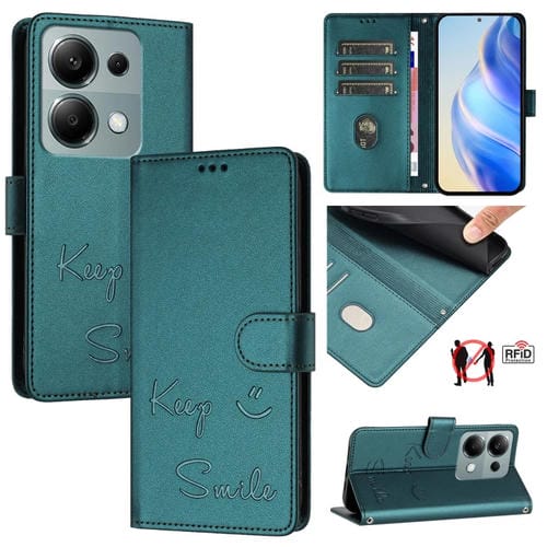 Funda de Cuero Rfid con Relieve de Sonrisa Global para Redmi Note 13 Pro 4G (Verde Pavo Real)