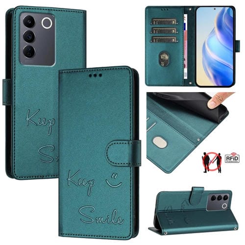 Funda de Cuero Rfid con Relieve de Sonrisa Global para Vivo V27E 4G (Verde Pavo Real)