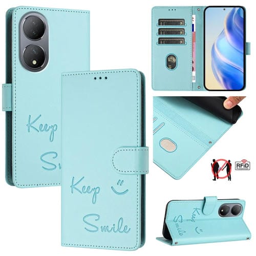 Funda de Cuero Rfid con Relieve de Sonrisa Global para Vivo Y100 5G (Verde Menta)