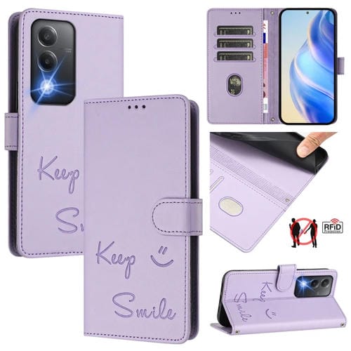 Funda de Cuero Rfid con Relieve Sonriente para Oppo A80 5G Eu (Morado Claro)