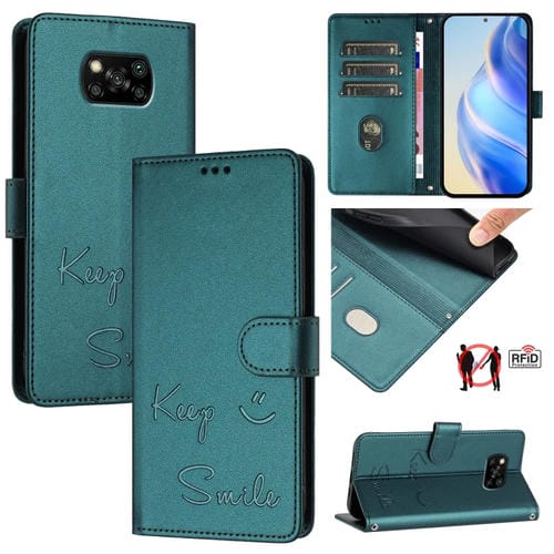 Funda de Cuero Rfid con Relieve Sonriente para Xiaomi Poco X3 / X3 Nfc / X3 Pro (Verde Pavo Real)