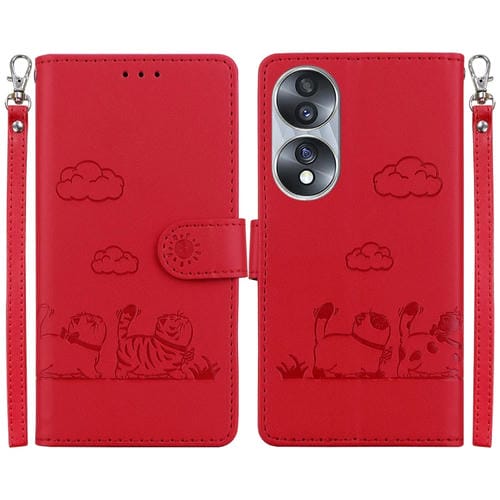 Funda de Cuero Rfid para Honor 70 con Diseño de Gatos (Roja)