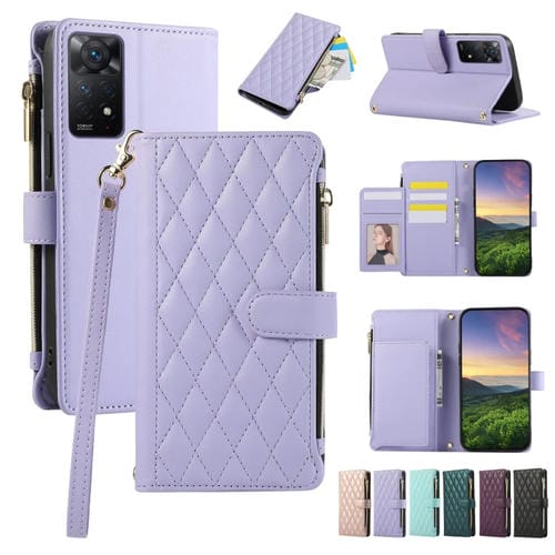 Funda de Cuero Tipo Billetera con Cremallera Rombal para Redmi Note 11 Pro 4G (Morado)