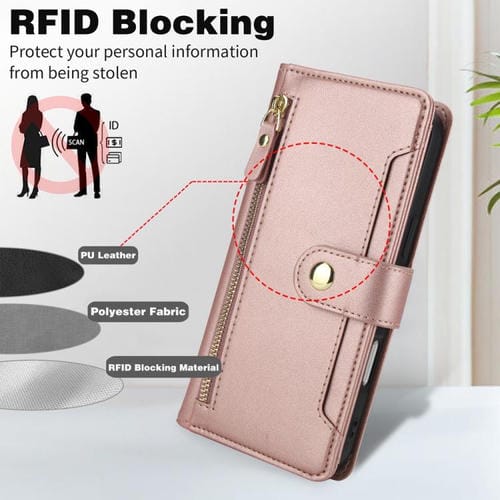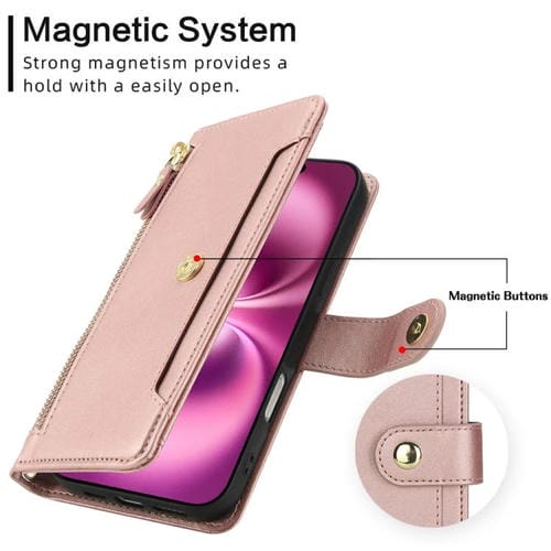 Funda de cuero tipo billetera con cremallera y siete ranuras para tarjetas para iPhone 17 (oro rosa)