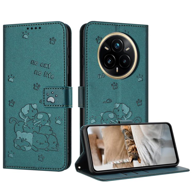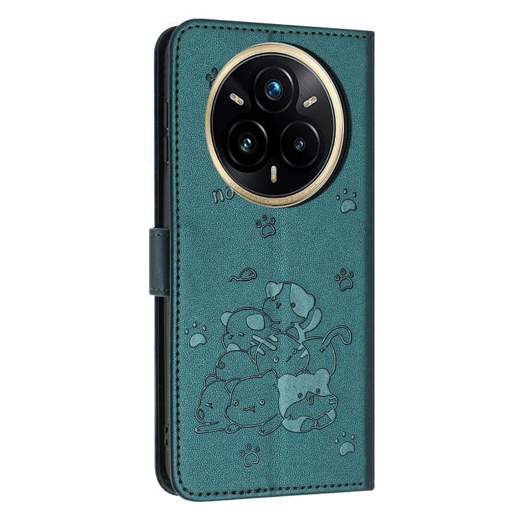 Funda de Piel con Diseño de Gatito En Relieve para Realme 14 Pro+ con Cordón (Verde Oscuro)