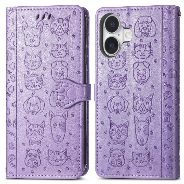 Funda de piel con estampado de gato y perro para iPhone 17 (morada)
