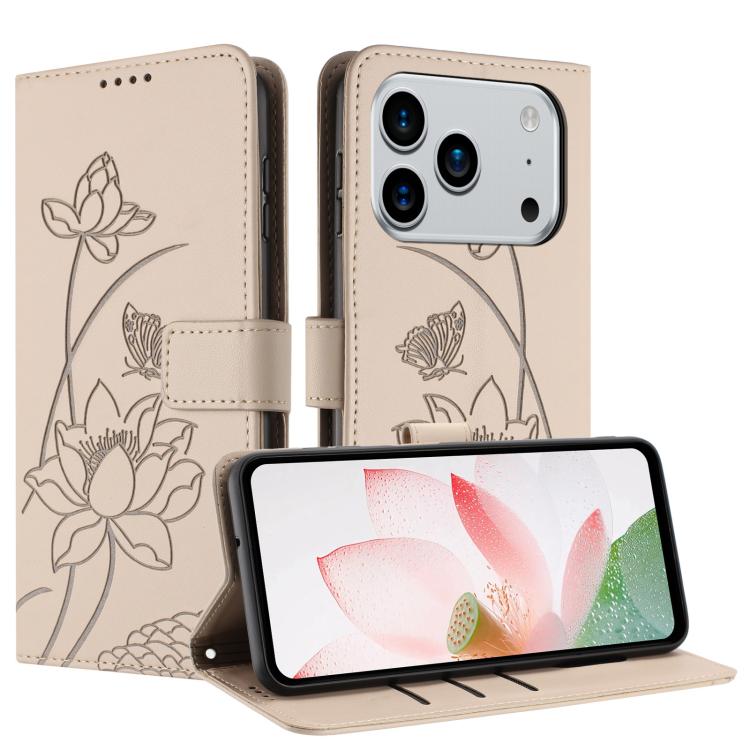 Funda de piel con relieve de loto y cordón para iPhone 17 Pro Max (beige)