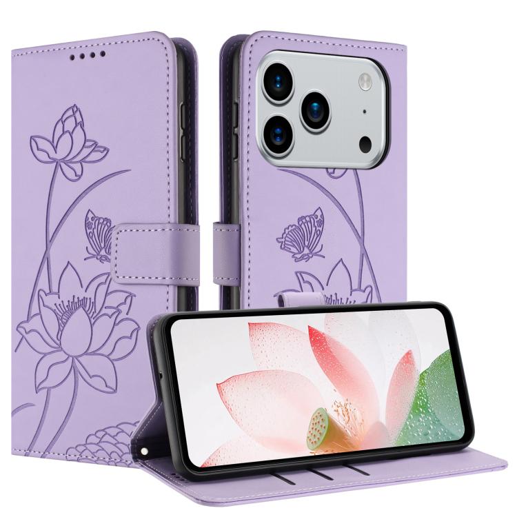 Funda de piel con relieve de loto y cordón para iPhone 17 Pro Max (morado)