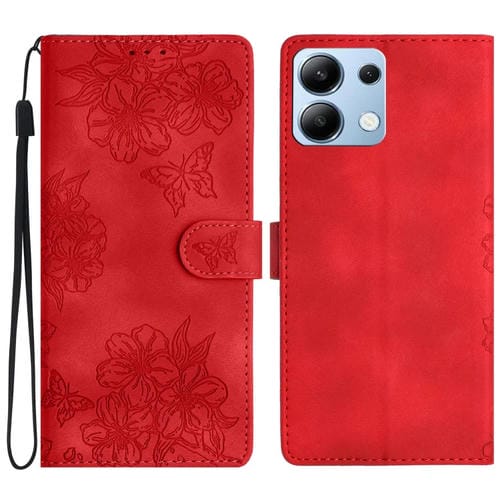 Funda de Teléfono de Pu con Relieve de Piel de Mariposa y Diseño de Flor de Cerezo para Redmi Note 13 4G (Rojo)