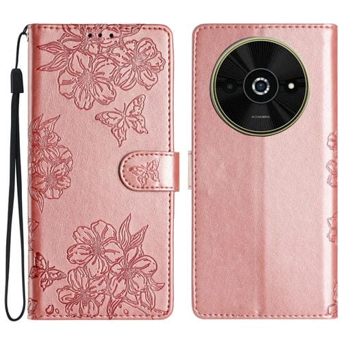 Funda de Teléfono de Pu con Relieve de Piel de Mariposa y Flor de Cerezo para Xiaomi Poco C61 (Oro Rosa)