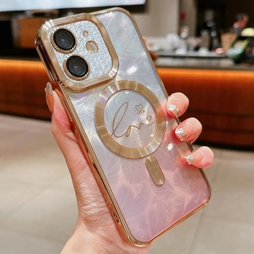 Funda de Teléfono TPU Magsafe Dual-Love con Purpurina y Degradado de Plumas para iPhone 12 (Dorada)