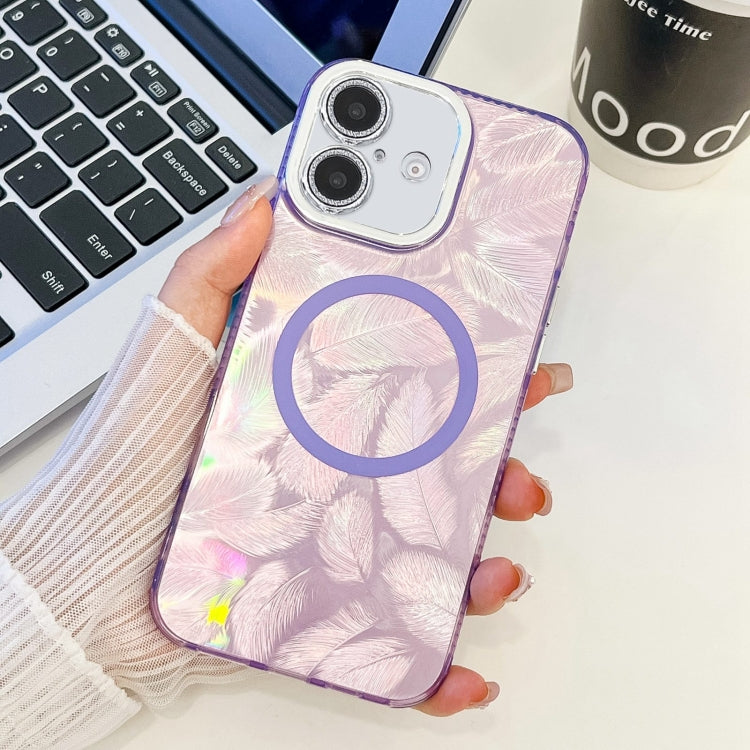 Funda de Teléfono TPU Magsafe iPhone 16 Textura Enchapada Película Lente Purpurina (Plumas Moradas)