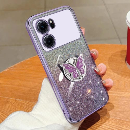Funda de TPU para Teléfono con Soporte de Mariposa con Purpurina Degradada Plateada para Oppo K10 (Púrpura)