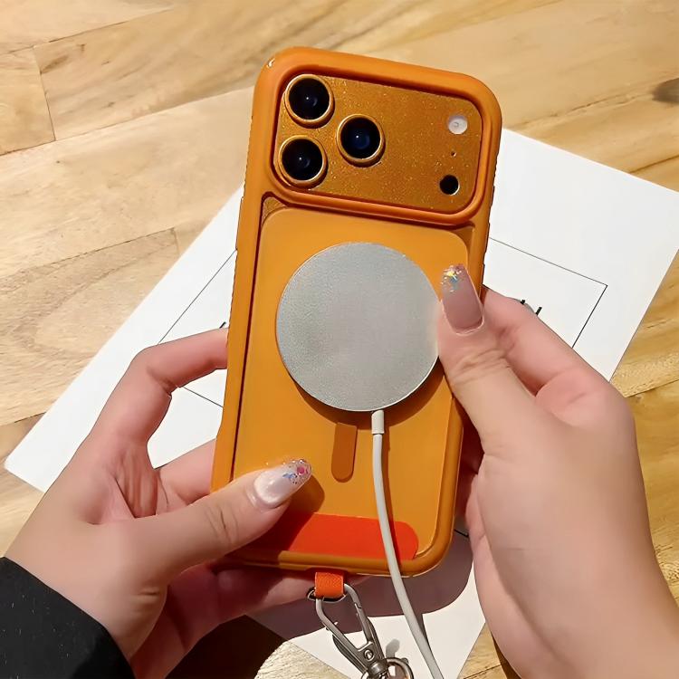 Funda magnética MagSafe transparente con borde liso y correa para la muñeca para iPhone 17 Pro Max (marrón)