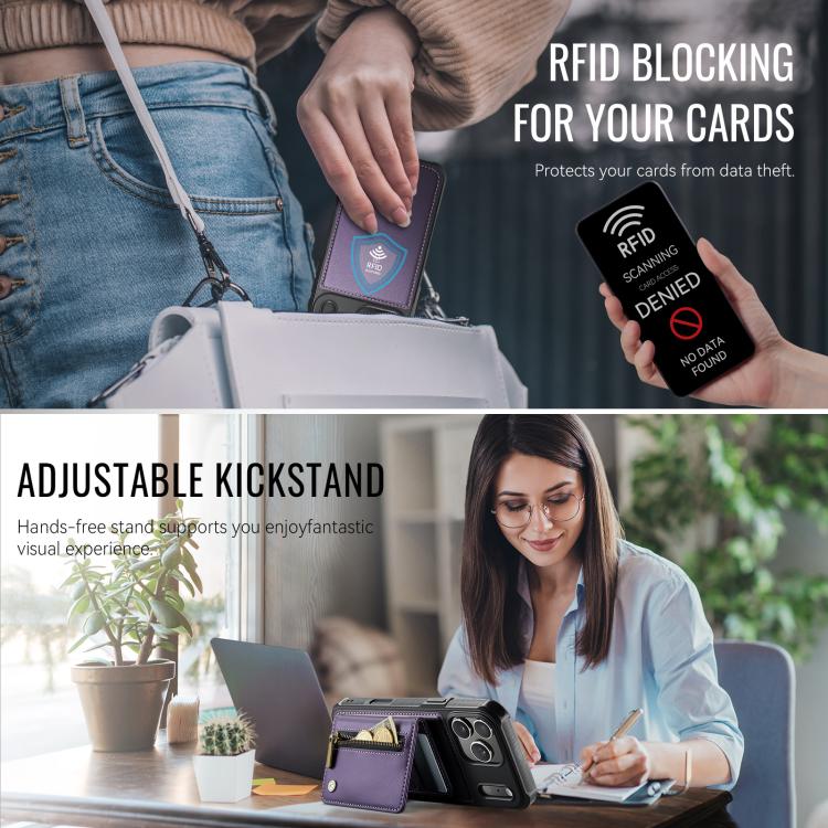Funda para iPhone 17 Pro Max JEEHOOD J12 con cremallera RFID MagSafe y tarjetero (morado)