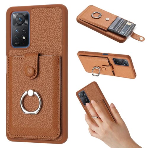 Funda para Teléfono con Diseño de Textura de Lichi para Redmi Note 11 Pro 4G, con Soporte para Anillo y Diseño de Tarjeta (Marrón)