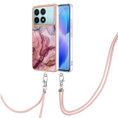 Funda para Teléfono con Imd de Doble Cara con Galvanoplastia de Mármol para Xiaomi Poco F6 Pro 5G con Cordón (Rojo Rosa 014)