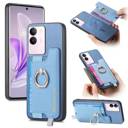Funda para Teléfono con TaRJetero y Anillo de Cuero con Diseño Retro Magsafe Cross para Vivo S17/S17 Pro/V29 Pro 5G (Azul)