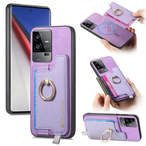 Funda para Teléfono con TaRJetero y Anillo de Cuero con Diseño Retro Magsafe para Vivo Iqoo 11 Pro 5G (Morado)