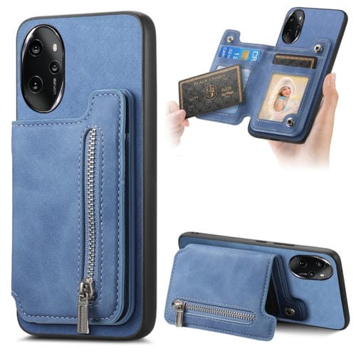 Funda para teléfono Honor 100 Pro con tarjetero y cremallera retro Magsafe (Azul)