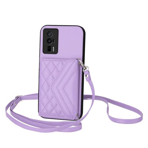Funda para Teléfono con Textura Rómbica y TaRJetero Rfid para Xiaomi Poco F5 Pro 5G con Cordón Largo (Morado Claro)