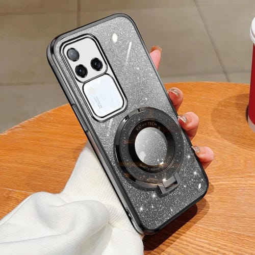 Funda para Teléfono de TPU con Soporte Redondo y Purpurina Degradada Plateada para Vivo S18 Pro (Negra)