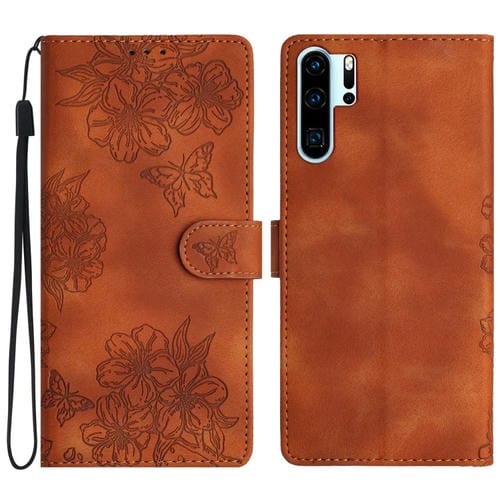 Funda para Teléfono Huawei P30 Pro con Relieve de Piel de Mariposa y Flor de Cerezo (Marrón)