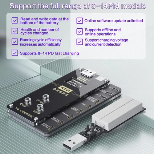 El Instrumento de Reparación Integral Multifunción I2C KC01 es una herramienta especializada diseñada para la reparación y mantenimiento de Baterías en dispositivos Apple iPhone, compatible con modelos desde iPhone 6 hasta iPhone 14 Pro Max. Esta versión estándar permite la lectura y escritura de datos en la parte inferior de la Batería, facilitando la modificación del estado y número de ciclos, así como la optimización automática de la eficiencia del ciclo de funcionamiento. Su función principal es proporcionar una Carga eficiente y rápida sin causar daños al componente, alcanzando hasta un 65% de Carga en 30 minutos. Además, soporta actualizaciones de software en línea ilimitadas y operaciones tanto en línea como fuera de línea, con monitoreo en tiempo real del voltaje y Corriente de Carga para un control preciso durante el proceso de reparación.