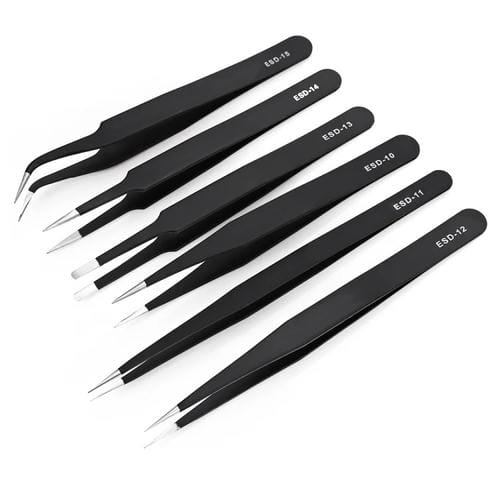 • Incluye 6 tipos de pinzas: ESD-10 (estándar), ESD-11 (punta fina), ESD-12 (alta fuerza elástica), ESD-13 (cabeza redonda), ESD-14 (ultrafina, 12 cm), ESD-15 (punta de águila doblada)