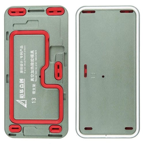 El Marco LCD de Pantalla para iPhone 13 con molde de eliminación de pegamento y calentamiento al vacío con Soporte es una herramienta profesional diseñada para facilitar la reparación y mantenimiento de la Pantalla de este modelo específico de Apple. Este equipo permite la eliminación precisa del Adhesivo OCA mediante un calentamiento uniforme que suaviza la viscosidad del pegamento, facilitando así el desmontaje y la preservación de la presión durante el proceso. Fabricado con aleación de aluminio de alta resistencia combinada con material de silicona, ofrece una estructura robusta y duradera que asegura una sujeción firme y sin deformaciones. Su diseño incluye un ajuste en espiral antideslizante y ranuras de precisión para un manejo seguro y eficiente, optimizando las operaciones de reparación de la Pantalla LCD del iPhone 13.