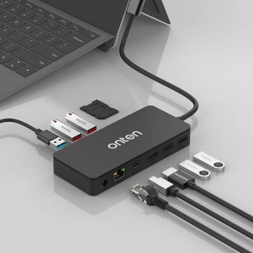 La estación de acoplamiento multifunción Onten SD12 está diseñada específicamente para la serie Microsoft Surface, ofreciendo una solución integral para ampliar la conectividad y funcionalidad de estos dispositivos. Este modelo permite la Conexión simultánea de hasta 12 interfaces, facilitando la gestión eficiente de múltiples periféricos y dispositivos externos. Cuenta con salidas de video de alta definición mediante interfaces MINI DP y HDMI, soportando resolución 4K a 60Hz y la función de visualización multiPantalla MST para una experiencia visual avanzada y profesional. Además, incluye Puertos USB 3.0 y USB 2.0 para transferencia de datos, un Puerto USB-C de alta velocidad, y un Puerto USB con Carga rápida QC 3.0, optimizando la conectividad y Carga de dispositivos Móviles. La estación también integra una ranura para Lector de Tarjetas SD 3.0, una interfaz de audio de 3.5 mm para Conexión de Micrófono y Altavoces, y un Puerto Gigabit Ethernet para Conexión de red estable y rápida. Fabricada en ABS, presenta dimensiones compactas que facilitan su integración en espacios de trabajo.