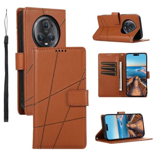 Funda para Honor Magic5 Pro PU con Línea en Relieve y Textura de Cuero Genuino (Marrón)