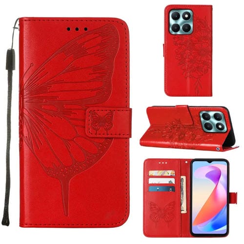 Funda para Honor X6A de Cuero con Mariposa en Relieve (Rojo)