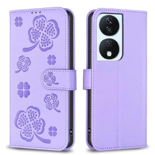 Funda para Honor X7B de Cuero con Relieve de Cuatro Hojas (Púrpura)