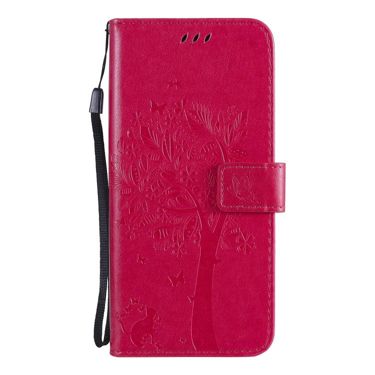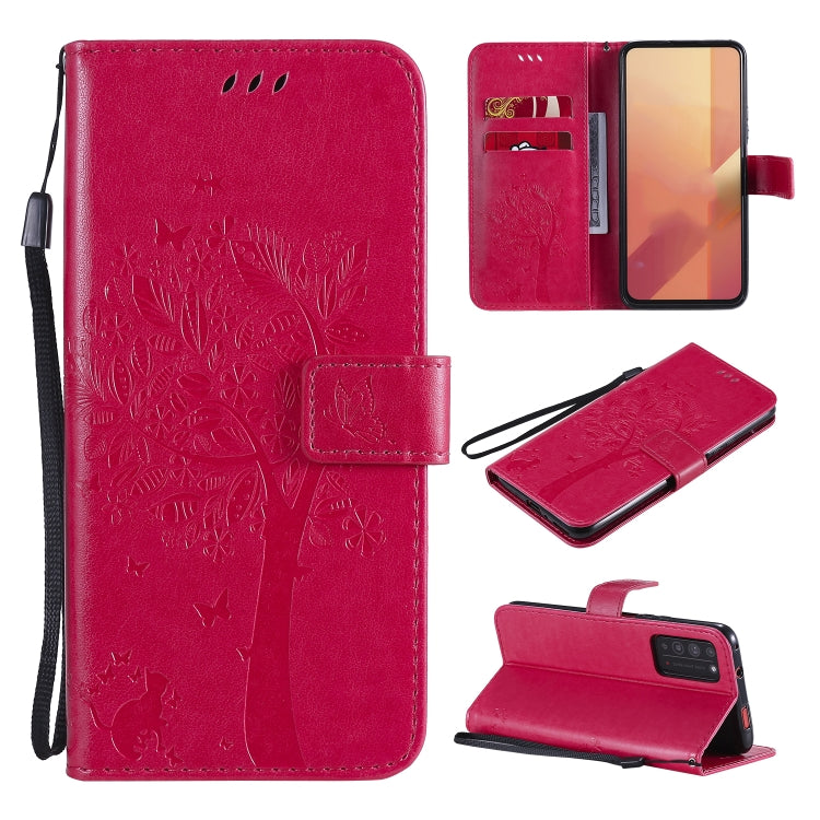 Funda de Cuero para Huawei Honor X10 5G con Patrón Árbol y Gato, Tapa Horizontal, Soporte, Ranuras y Cordón (Rosa Roja)