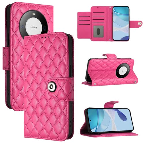 Funda para Huawei Mate 60 Pro y 60 Pro+ con Tapa de Cuero Textura Rómbica y Cordón (Rojo Rosa)